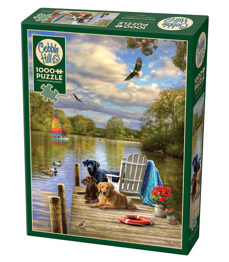 It's a Dog Day Afternoon on the docks with sailboats, kayaks, eagles and ducks all enjoying this sunshine filled day. Take an adventure with Cobble Hill's 1000 piece random cut puzzle that includes a reference poster.